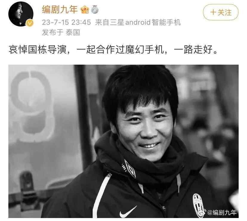 7月15日晚,《魔幻手机》系列编剧九年发文悼念导演周国栋:“哀悼国栋导演,一起合作过《魔幻手机》,一路走好。”