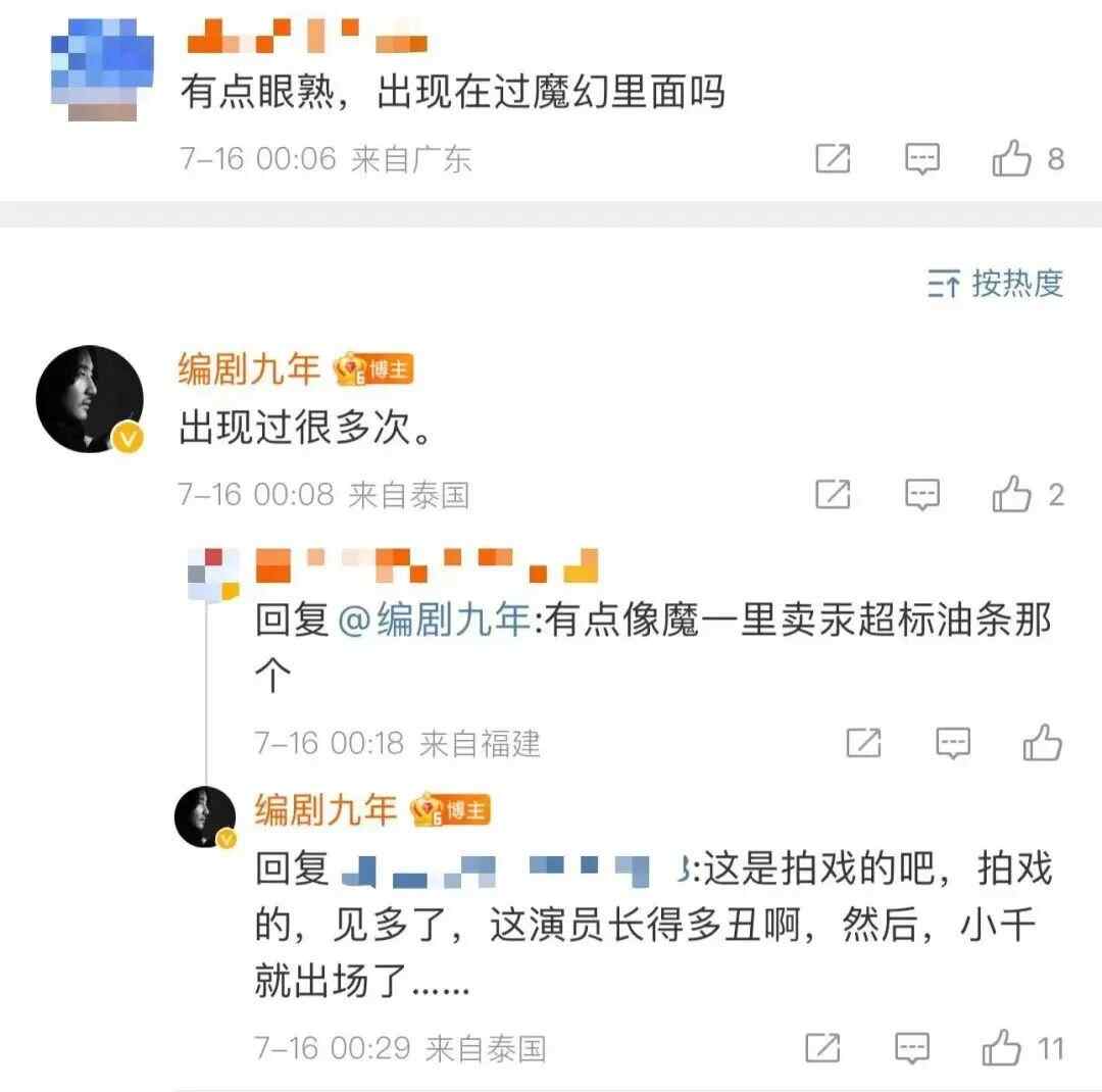 眼尖的网友发现,周国栋不仅是《魔幻手机》的执行导演,也是剧中的演员。随后“编剧九年”回复证实,周国栋曾以配角的身份在剧中出现多次。