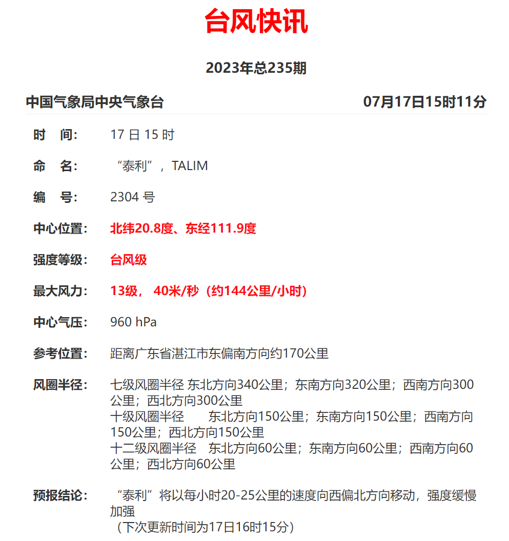 7月17日15时,今年第4号台风“泰利”中心位于北纬20.8度、东经111.9度,距离广东省湛江市东偏南方向约170公里,中心附近最大风力13级, 达40米/秒(约144公里/小时)。预计,“泰利”将以每小时20-25公里的速度向西偏北方向移动,趋向阳江到徐闻沿海,强度缓慢加强,最强可达台风级或强台风级(12到14级),较大可能于今天夜间在上述沿海地区登陆。