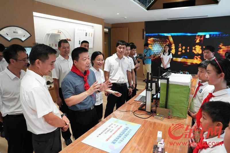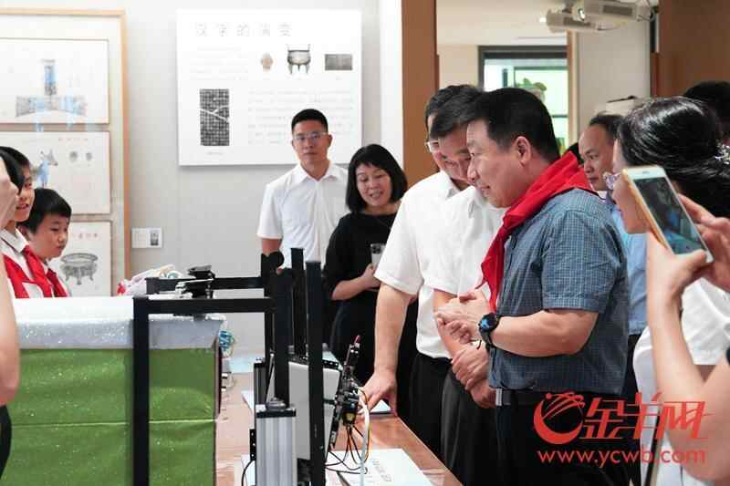 二楼的汉字数字博物馆,呈现了中华汉字的文化之源。杨利伟欣赏了“小小发明家”的作品,通过“小小发明家”的讲解,杨利伟了解了同学们的发明作品《北极玄武》《智能人脸运送取物机器人》《智能沙滩垃圾清理机器人》《基于语音识别的听障人士呼叫装置》《机场跑道路面安全巡检机器人》等。