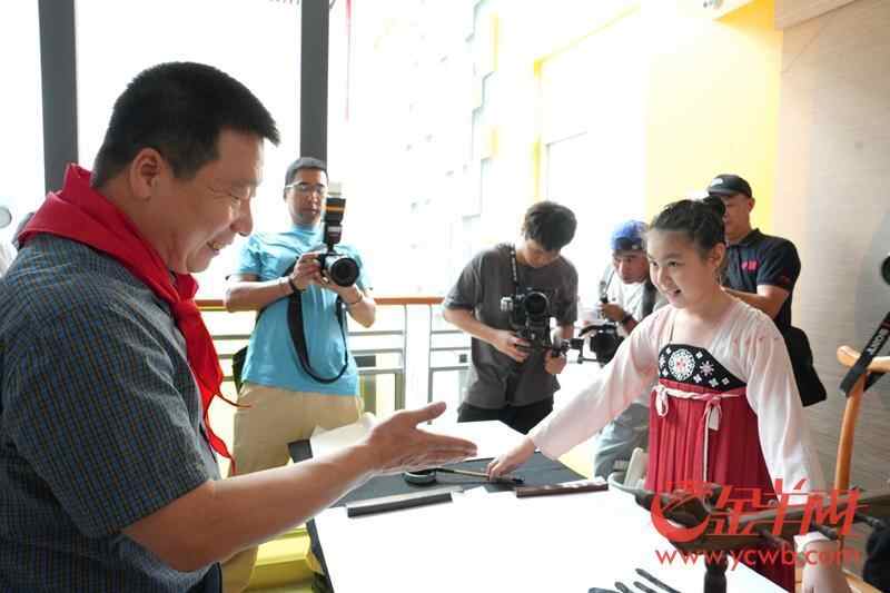 杨利伟一走进校园,映入眼帘的,便是浓重的非遗色彩与现代高科技深度融合的美好校园。穿着“宇航服”的附小学生和少先队员们已经列队,在校道上向杨利伟敬礼问好,并为杨叔叔戴上红领巾,热情邀请杨叔叔在小朋友的宇航服上签名。少先队员迎上来,向杨叔叔献上鲜花,一年级小导游牛浩然,为杨叔叔和领导嘉宾介绍附小的美好教育特色。