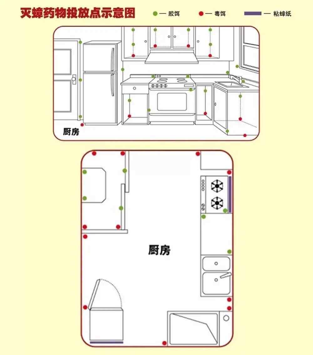 告别蟑螂噩梦,最好的方式还是用饵剂、胶饵等药物手段灭杀。下面这几张图可以帮助大家更加直观地了解怎么投放蟑螂药,详细说明了胶饵、毒饵、蟑螂纸的投放位置。当然,三种药不一定都要买,根据需求选购即可。
