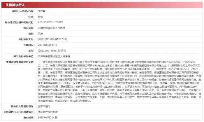 中国执行信息公开网显示,目前恒信玺利存在多条被执行人信息,恒信玺利和李厚霖也多次收到限制消费令。