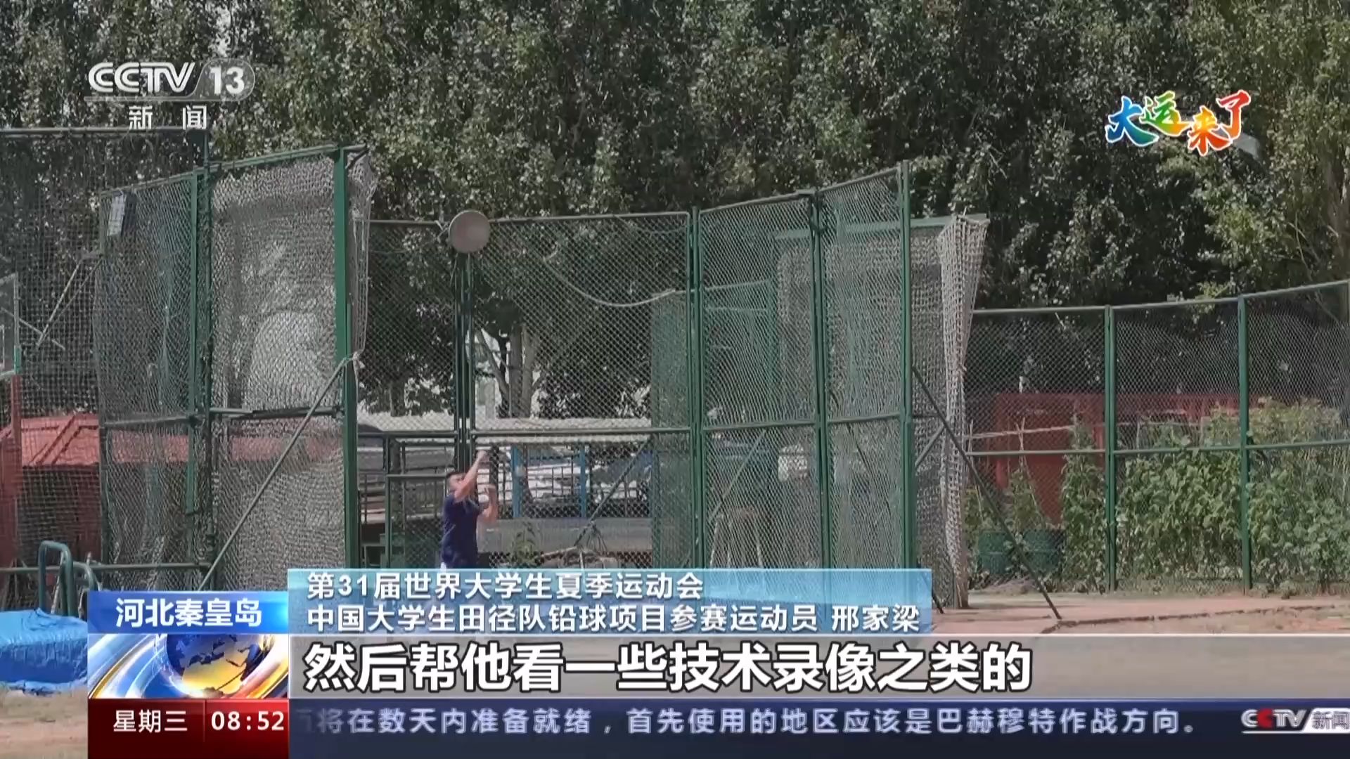 第31届世界大学生夏季运动会中国大学生田径队铅球项目参赛运动员 邢家梁:他自己训练的话,他没法看到自己的技术动作是什么样,很容易疏忽一些问题,我可能会经常去和他一起训练投铁饼,然后帮他看一些技术录像之类的,就想帮他把技术能巩固一下,改进一下。