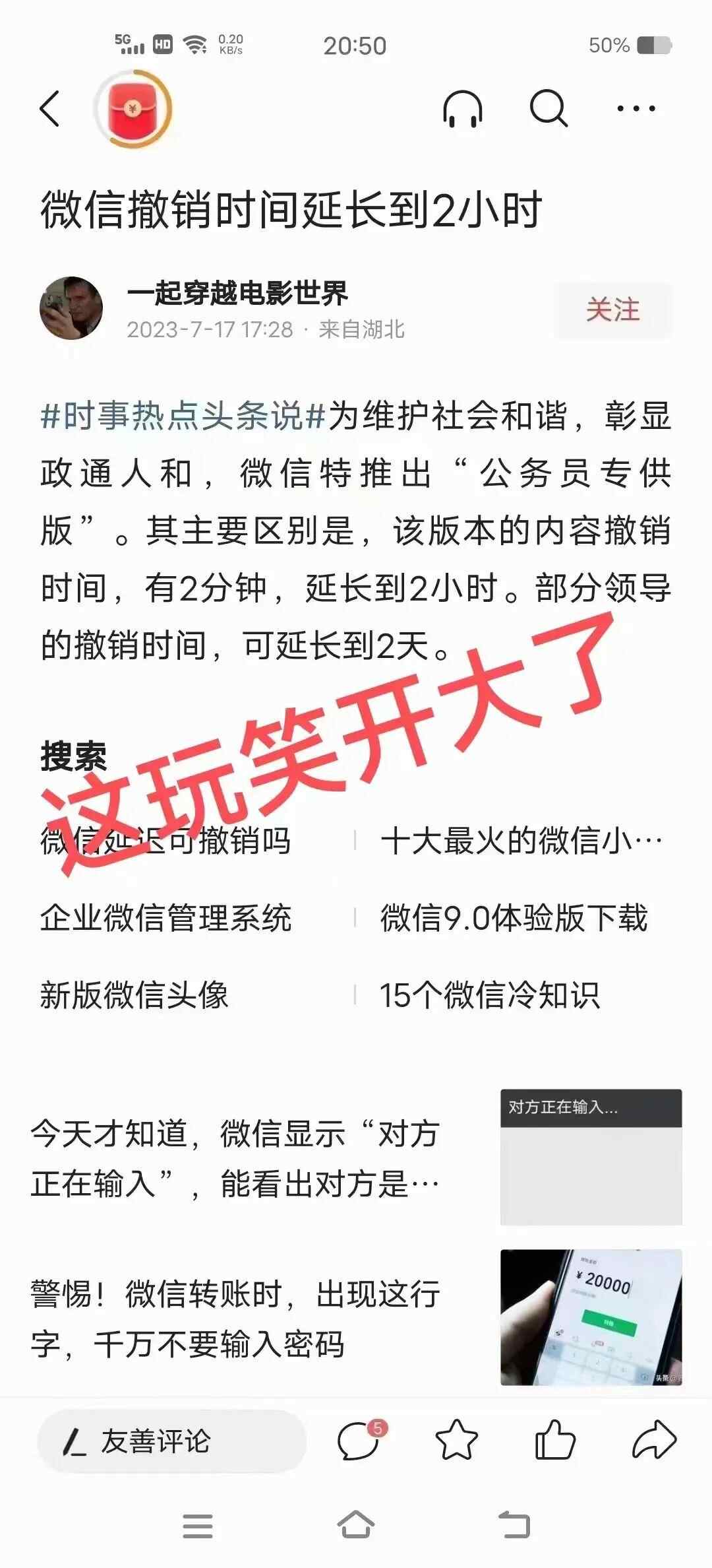 传闻中提到,微信将推出“公务员专供版”,打破微信以往的撤回时限,由原本的2分钟延长至2小时,且部分领导的撤回时间可延长至2天。