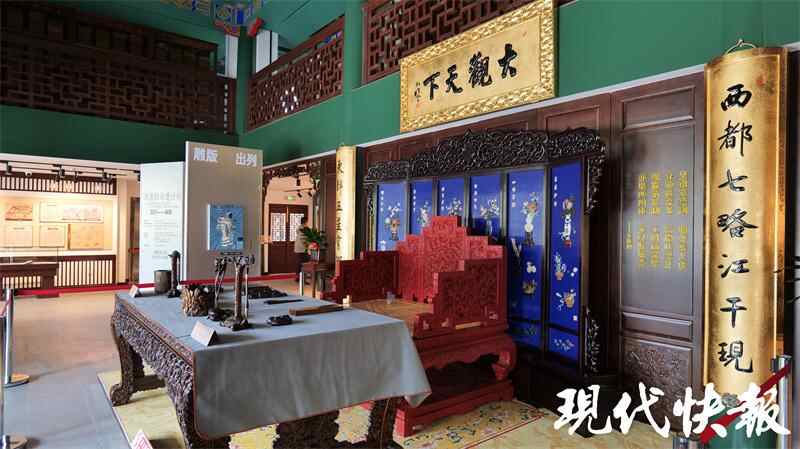 记者在现场看到,复建的文汇阁主体建筑尊重历史原貌,仿照天一阁建筑规制,面阔六间,明二暗三,硬山筒瓦。走进文汇阁,一楼主要是文汇阁历史文化展陈区域。大厅正中,摆放了一张抄书桌,当年读书人可以在此借书、抄书。书桌上方有一块写着“大观天下”的匾额,据工作人员介绍,当年天宁寺行宫御花园的正殿叫做“大观堂”,文汇阁就建在大观堂旁边,“大观天下”寓意读书可以开阔眼界、胸怀古今、放眼天下。