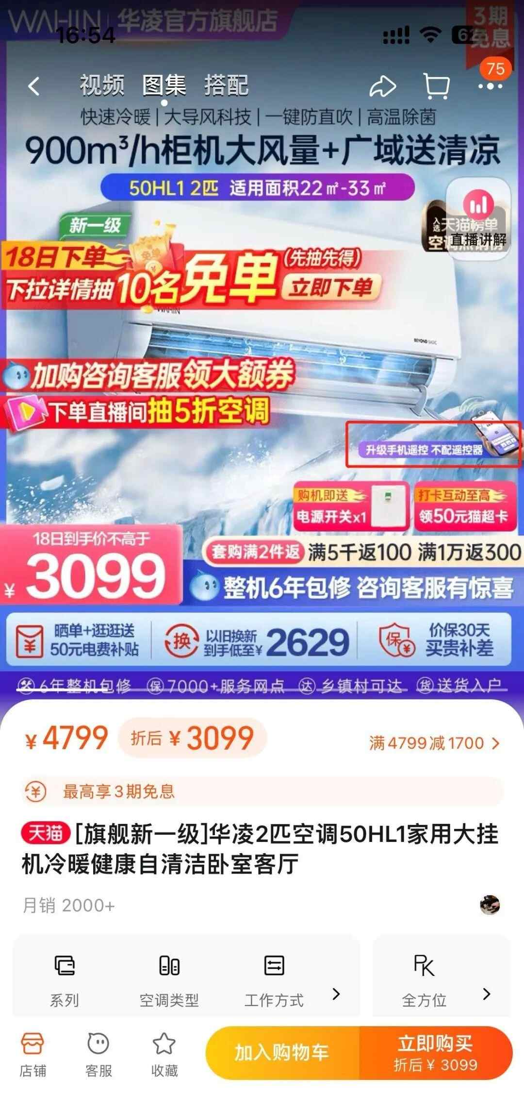 另一个争议焦点,在于华凌空调不配遥控器的提示信息是否足够醒目。7月18日,记者查询华凌天猫官方旗舰店多款商品的链接发现,商品首页只有一行不起眼的小字,提醒“升级手机遥控,不配遥控器”,其他相关标识则藏在商品详情页中,需要下滑或翻页才能留意到。