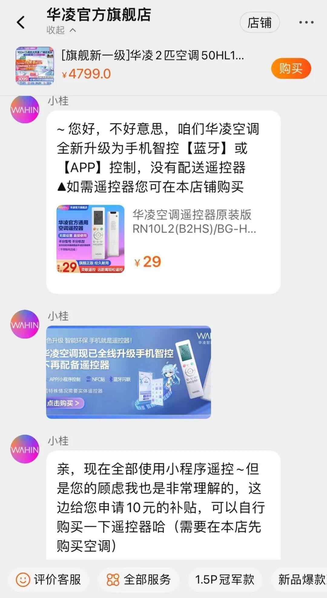 而当记者询问该客服人员是否配送遥控器时,得到的答复是:“华凌空调全面升级为手机智控蓝牙或APP控制,没有配送遥控器,如需遥控器可在本店铺购买。”随后还发来售价为29元的遥控器购买链接,并承诺可以申请10元补贴,相当于每个遥控器售价19元。