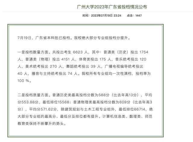 广州大学表示,除建筑规划与土木工程专业组外,普通物理类绝大部分专业组的最高分、最低分及排位都有提升。
