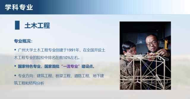 广州大学土木工程学院官网显示,该校土木工程专业创建于1991年,为国家首批“一流专业”建设点。