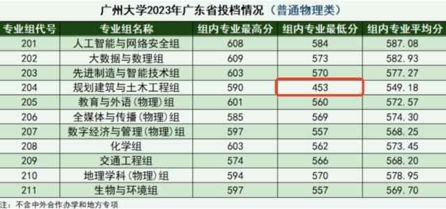广州大学昨晚公布的“广州大学2023年广东省投档情况”显示,该校今年普通物理类投档分数最低的为规划建筑与土木工程组,即网友热议的453分。该组最高分为590分,平均分达到549.18分↓↓↓