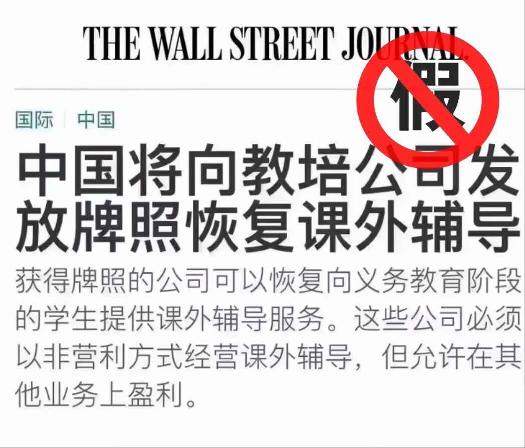 7月20日,据中国民办教育协会官微消息,近日,网络又传“中国将向教培公司发放牌照恢复课外辅导”为标题的图片,再次提醒:此信息纯属谣言,系别有用心之人恶意反复炒作。原消息有关内容为对政策的误读误解,与“双减”政策不符。