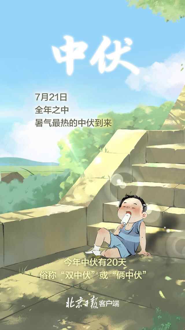 今天,正式进入中伏!三伏分为初伏、中伏和末伏。中伏,也叫二伏,可能是10天,也可能是20天。今年中伏为20天,从7月21日至8月9日,俗称“双中伏”或“俩中伏”。