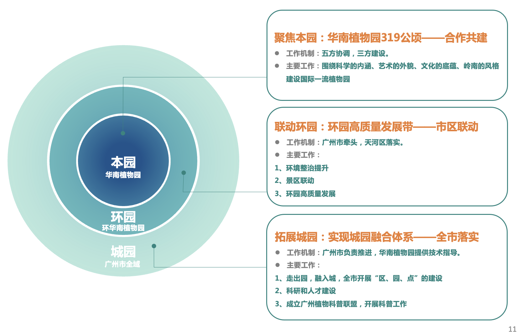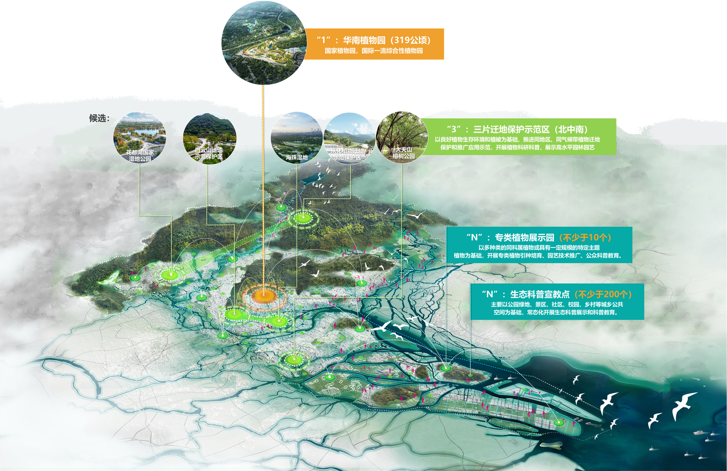 拓展城园,即依托华南国家植物园,拓展植物园的迁地保护、科研科普的社会服务功能,坚持空间拓展、差异发展、优势互补的原则,构建国内首个“1+3+N”城园融合体系。
