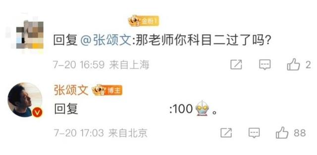 网友继续追问:科目二过了吗?这次,张颂文直接回复了:“100!”