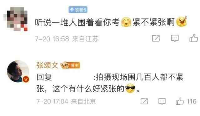 网友又追问:被一堆人围观看着考会不会紧张啊?张颂文又淡定地回复:“拍摄现场围几百人都不紧张,这个有什么好紧张的。”