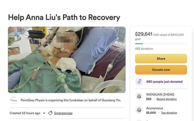 刘女士三年前和丈夫一起移民加拿大。事发当天,她驾车回家路上突然遭到陌生人枪击。7月20日,刘女士的家人在网络上发布了筹款请求,并说明她的伤势。刘女士伤势严重,目前在医院重症监护室抢救。
