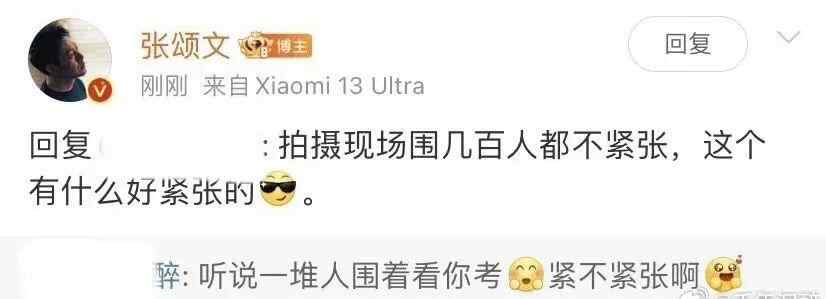 有好奇的粉丝留言问张颂文“老师你科目二考过了吗?”张颂文回复表示自己考了100分。还有网友问他紧张不,张颂文称拍摄现场围了几百人都不紧张,这个更没什么好紧张的。更有网友问他练车的时候被教练骂过吗?张颂文回复说,认真学、认真考,教练都很好的。