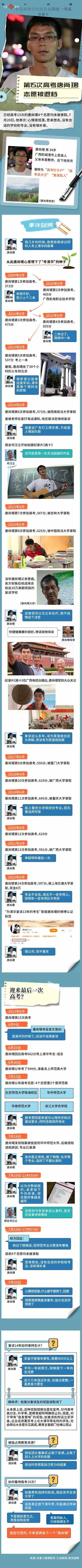 有媒体报道称,参加了15次高考的广西考生唐尚珺已被海南师范大学录取。