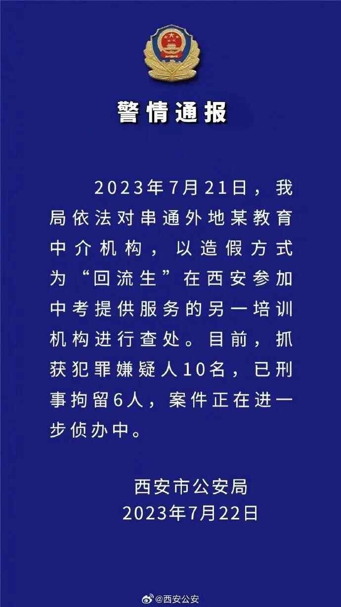 2023年7月21日,西安市公安局依法对串通外地某教育中介机构,以造假方式为“回流生”在西安参加中考提供服务的另一培训机构进行查处。目前,抓获犯罪嫌疑人10人,已刑事拘留6人,案件正在进一步侦办中。