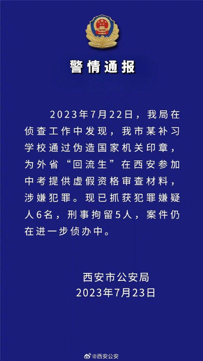 7月23日,西安市公安局发布警情通报称:“2023年7月22日,我局在侦查工作中发现,我市某补习学校通过伪造国家机关印章,为外省“回流生”在西安参加中考提供虚假资格审查材料,涉嫌犯罪。现已抓获犯罪嫌疑人6名,刑事拘留5人,案件仍在进一步侦办中。”