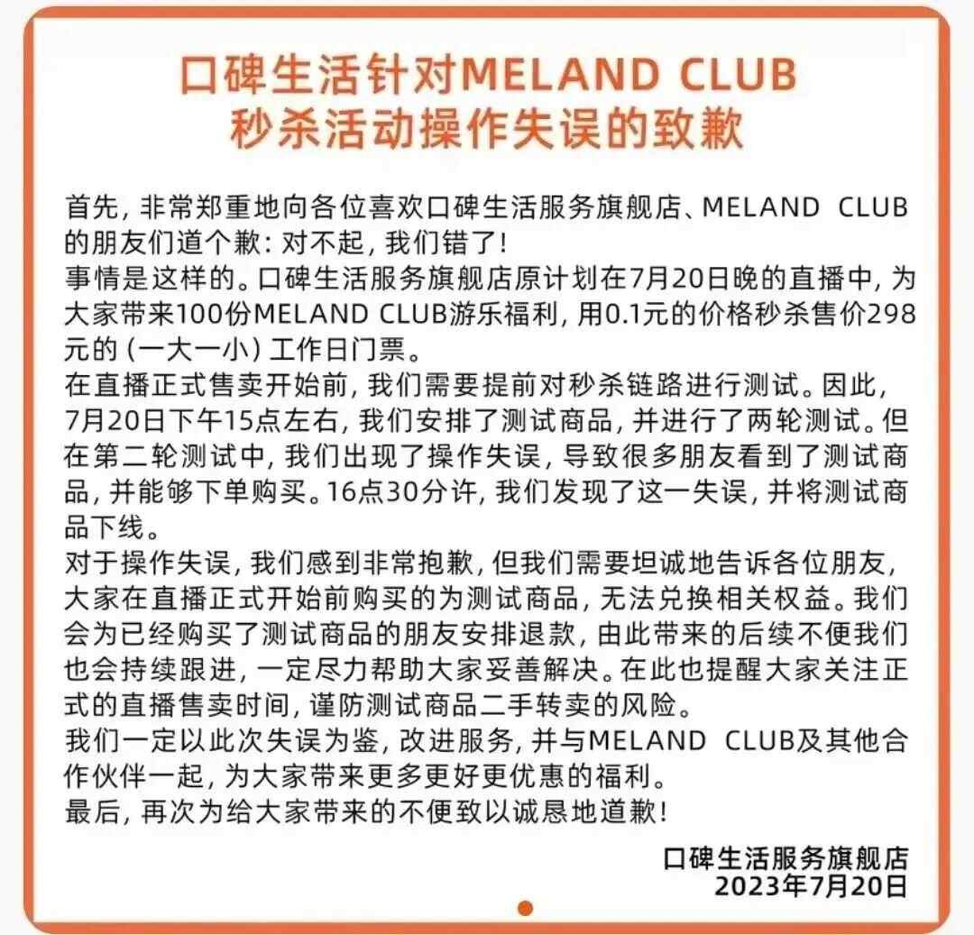 随后,口碑生活服务旗舰店在店铺首页贴出致歉信,声称原计划在7月20日晚的直播间设置100份Meland club游乐福利,用0.1元的价格秒杀售价298元的(一大一小)工作日门票。提前对秒杀链路进行测试时,出现了操作失误,导致很多用户看到了测试商品,并能够下单购买。