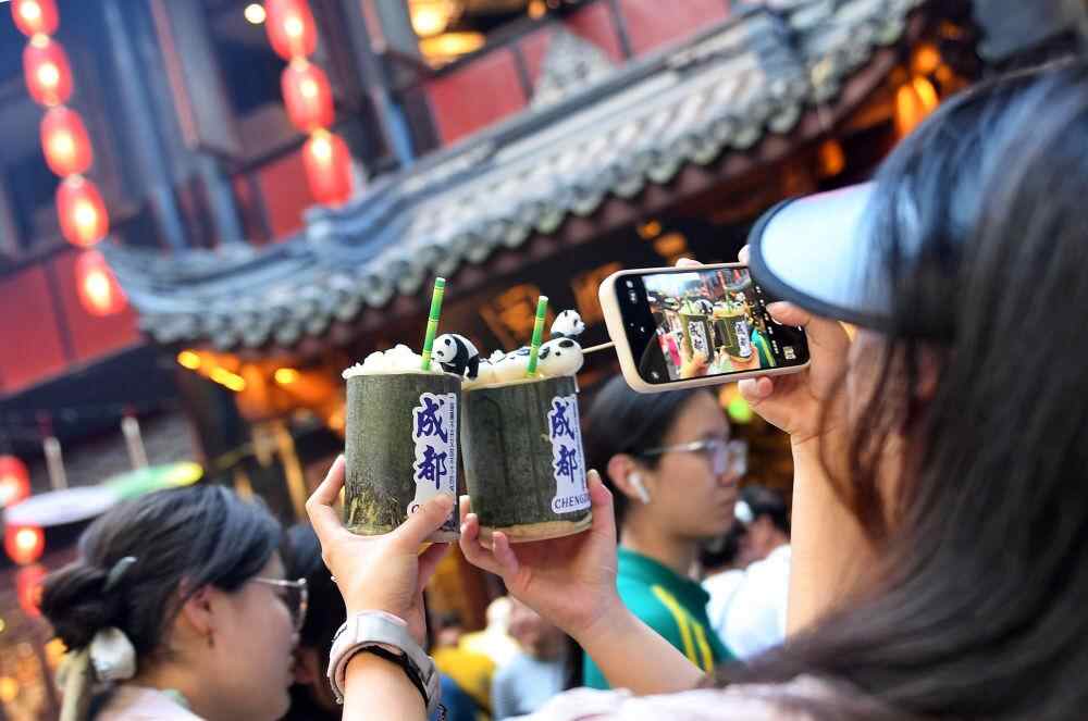 7月14日,两名游客在成都锦里用手机拍摄刚刚购买的特色饮品。新华社记者 刘坤 摄