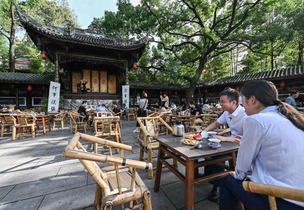 7月14日,在成都高新区铁像寺水街,游客在茶铺体验当地特色盖碗茶。新华社记者 王曦 摄