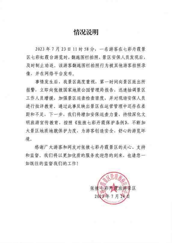 据“张掖七彩丹霞旅游景区”微信公众号消息,张掖七彩丹霞旅游景区24日发布情况说明称,2023年7月23日11时58分,一名游客在七彩丹霞景区七彩虹霞台游览时,翻越围栏拍照,景区安保人员发现后,及时制止劝返。该游客翻越围栏拍照行为被其他游客拍照录像,并在网络平台发布。