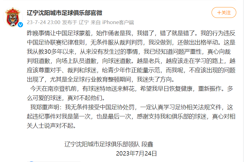 7月24日晚,辽宁沈阳城市足球俱乐部领队段鑫通过该俱乐部官方微博发文致歉。