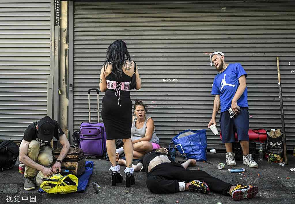当地时间2023年7月6日,美国宾夕法尼亚州费城,无家可归者和吸毒成瘾者在肯辛顿社区的街道上随处可见。(视觉中国)