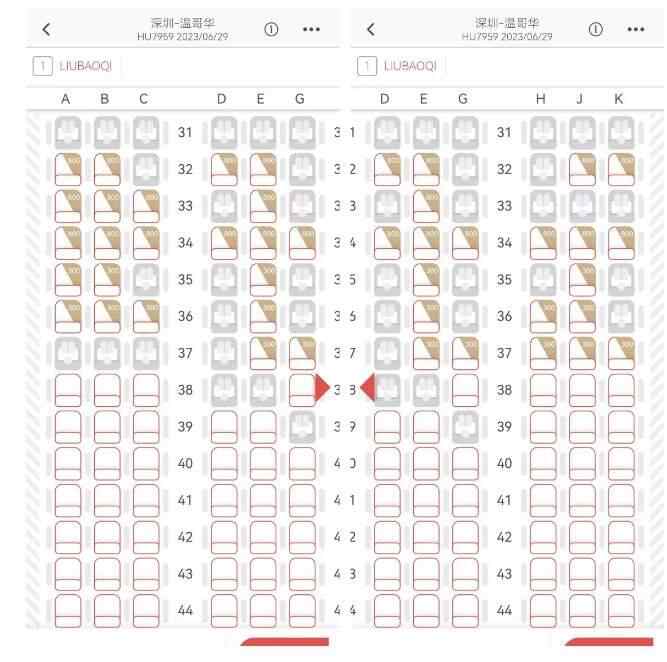 国航客服人员称,该航班31~60排属于经济舱。31~50排座位需要付费,尚有座位可选,价格分别有100元、200元、800元。其中,800元的座位是紧急出口和大空间位置。另外,50~58排是免费座位,目前只剩下中间位置可选。而后面几排座位已被锁定,需到机场选座。“座位大小无区别,主要是前后排区别。”