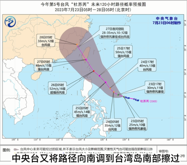 从7月23日起中央台又将路径向南调到台湾岛南部擦过,将穿过巴士海峡,向福建南部走。