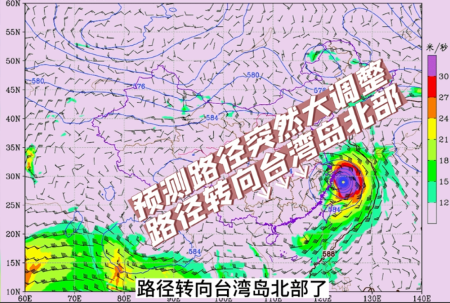21日早晨形成热带风暴后,模式对它的预测路径突然大调整,路径转向台湾岛北部。