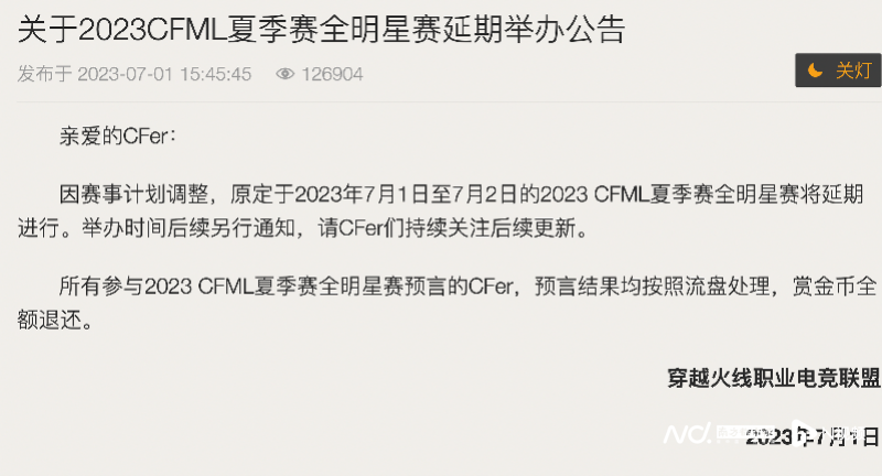 据悉,7月1日穿越火线职业电竞联盟曾发布夏季赛与全明星赛延期的公告。