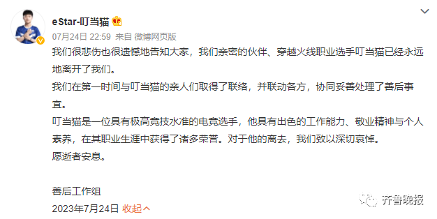 我们很悲伤也很遗憾地告知大家,我们亲密的伙伴、穿越火线职业选手叮当猫已经永远地离开了我们。