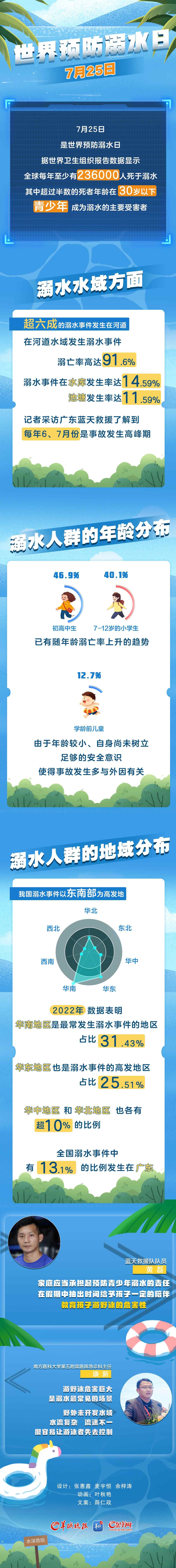 7月25日是世界预防溺水日。据世界卫生组织报告数据显示,全球每年至少有236000人死于溺水,其中超过半数的死者年龄在30岁以下,青少年成为溺水的主要受害者。