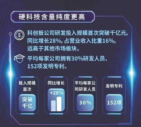 研发投入高,一直是科创板的突出特点。数据显示,2022年,科创板公司研发投入总规模首次突破千亿元,达到1285亿元,同比增长28%,研发投入占营业收入的比例平均为16%,同比提升3个百分点,远高于A股平均水平。其中,生物医药、集成电路等行业研发投入强度居前,不少企业研发投入占营业收入比例超过30%。