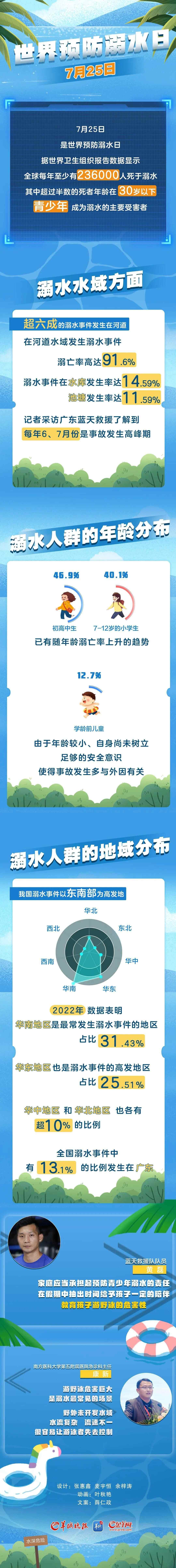 7月25日是世界预防溺水日。据世界卫生组织报告数据显示,全球每年至少有236000人死于溺水,其中超过半数的死者年龄在30岁以下,青少年成为溺水的主要受害者。