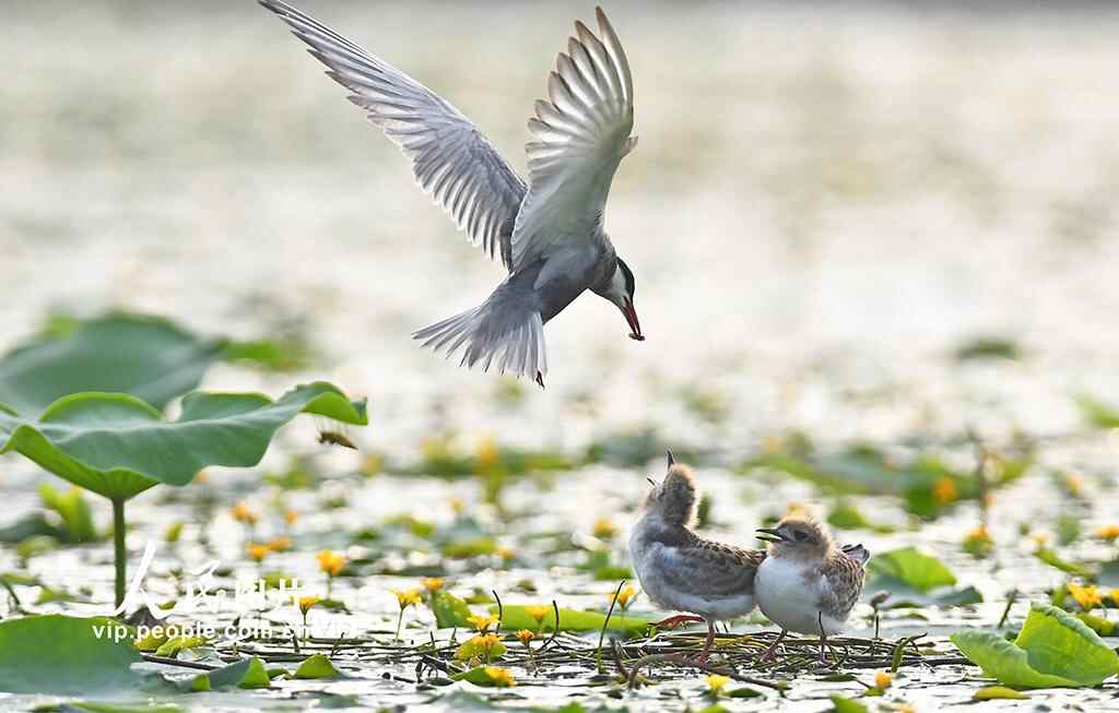 2023年7月23日,山东省泰安市东平县须浮鸥在哺育幼鸟。李志军摄(人民图片网)  2023年7月23日,山东省泰安市东...
