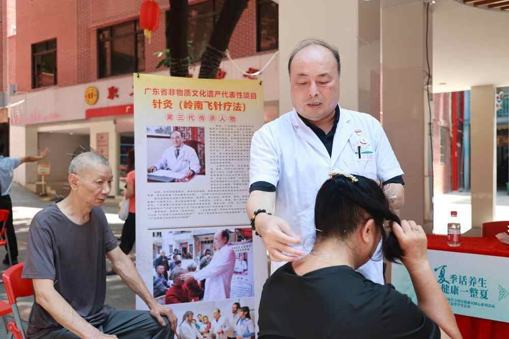 活动现场,岭南飞针展示摊位吸引了许多市民前来体验,这位施针者正是国家中医药管理局中医药文化科普巡讲团首席专家,广东省非物质文化遗产(岭南飞针疗法)代表性传承人,广东省第二中医院针灸康复科三病区区长、主任中医师秦敏。