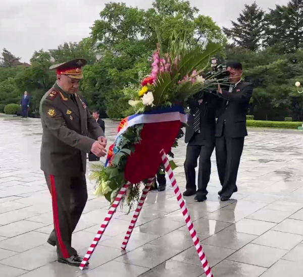 据塔斯社报道,俄国防部当天在Telegram上说,在参加上述活动前,绍伊古还向位于平壤万寿台山岗的朝鲜已故领导人金日成和金正日铜像献花。