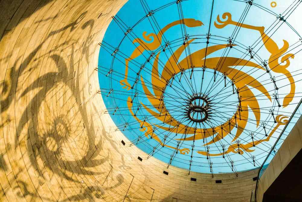 这是阳光透过成都金沙遗址博物馆陈列馆穹顶,在墙壁上投下太阳神鸟造型的影子(2022年3月10日摄)。新华社发(张艳 摄)