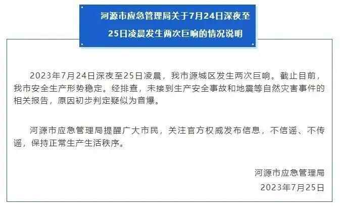 7月25日,河源市应急管理局发布关于7月24日深夜至25日凌晨发生两次巨响的情况说明,初步判定疑似为音爆。