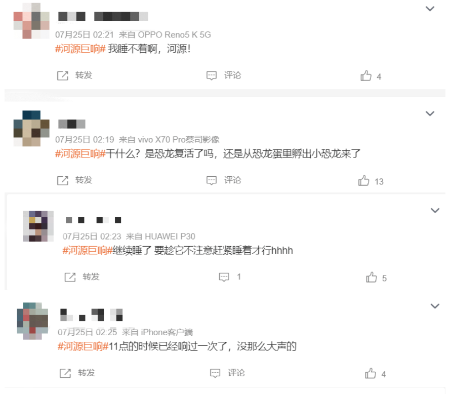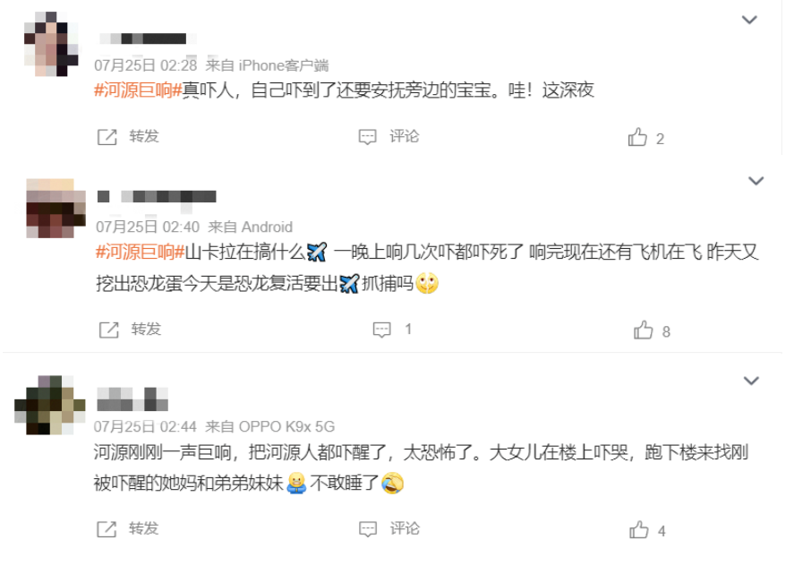 7月24日深夜至25日凌晨,广东省河源市源城区发生两次巨响,引发网友讨论,不少网友凌晨发帖表示听到很大的声音,被吓醒了。