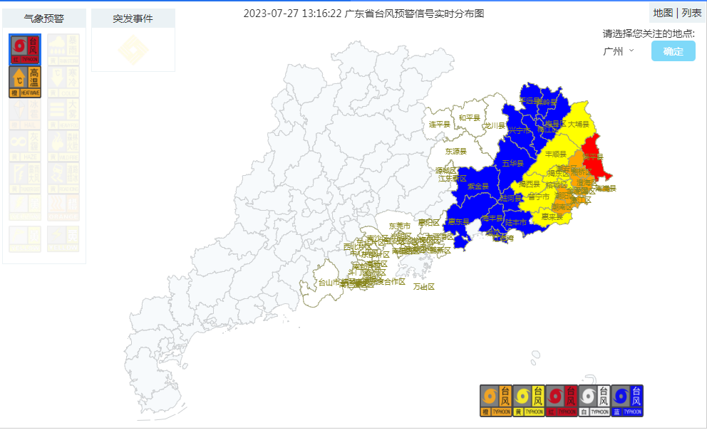 截至27日12时16分,广东最高等级台风预警信号已发至红色,其中潮州市饶平县已在27日11时40分将台风预警信号升级至红色,饶平县气象台预计27日夜间起该县沿海风力将逐渐加大至11—12级,阵风13—14级,并有明显降水,请当地继续加强。随着“杜苏芮”进一步移近,不排除广东各地后续调整或新发布台风及其他预警信号。