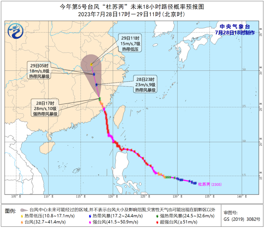 根据中央气象台观测,今年第5号台风“杜苏芮”在7月28日9时55分前后在福建省晋江市沿海登陆,登陆时中心附近最大风力15级(50米/秒),达到强台风级别。截至28日17时,“杜苏芮”位于福建省三明市尤溪县境内,已减弱至强热带风暴级别。广东省气象台28日表示,“杜苏芮”对广东的影响风险已明显降低; 但“杜苏芮”后侧偏南季风仍有可能为广东局地带来明显降水。展望30至31日,广东大部将再次转为炎热天气。