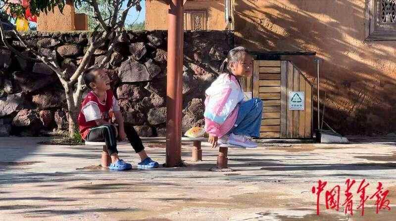 7月22日,妞妞(右)和小伙伴在吉好有果家的房子前。中青报·中青网见习记者 王雪儿/摄