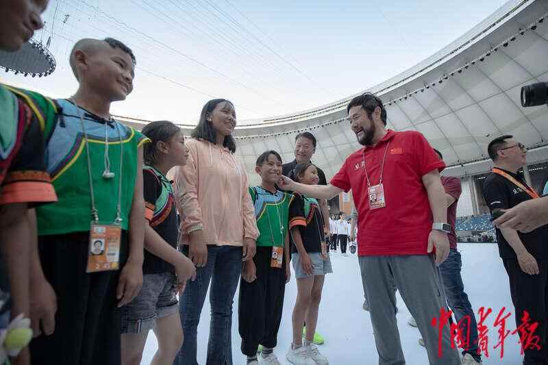 7月16日,成都东安湖体育场,成都大运会开幕式彩排现场,总导演陈维亚专门来到表演区中央,鼓励演唱《国旗国旗真美丽》的彝族孩子们。中青报·中青网记者 汪龙华/摄