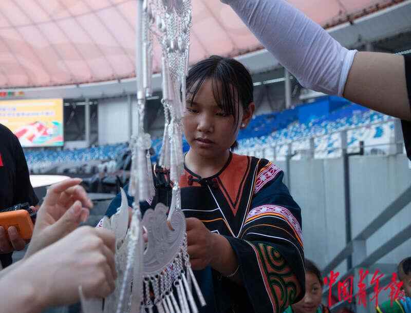 7月16日,成都东安湖体育场,成都大运会开幕式彩排现场,吉好有果正在整理演出时佩戴的饰品。中青报·中青网记者 汪龙华/摄